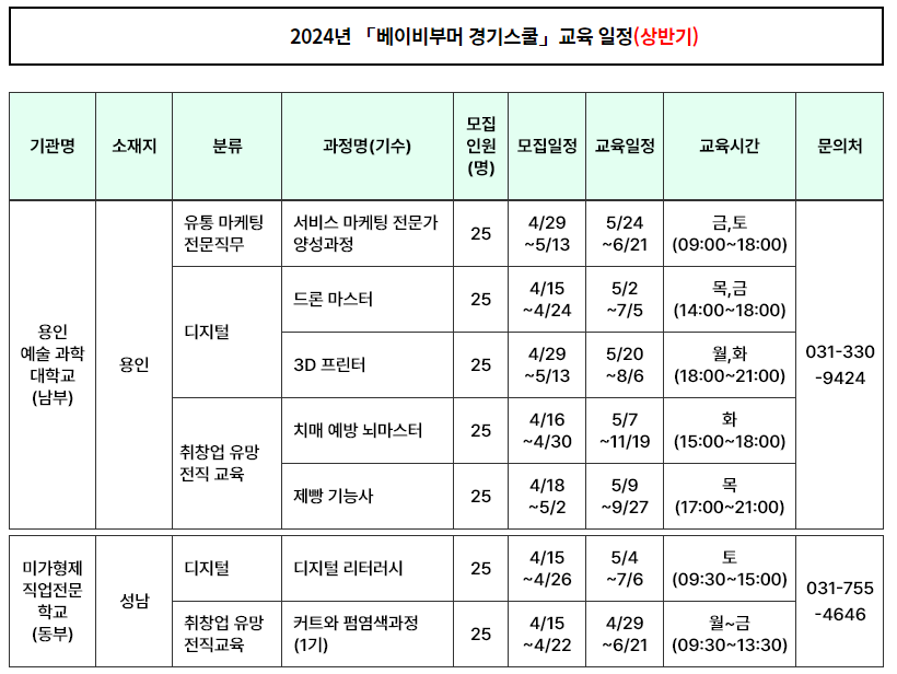 신청자는 2024년 베이비부머 경기스쿨 교육과정 중 1개 과정만 수강 가능합니다. 단, 기초-심화 연계 과정은 기초 과정 수료 후 심화과정을 수강할 수 있습니다. 2023년에 경기도생활기술학교를 수료한 경우에만 2024년 베이비부머 경기스쿨 교육과정을 수강할 수 있습니다. 단, 2023년 및 2024년 동일과정은 중복해서 수강할 수 없습니다. 2024년 경기도 평생배움대학 교육생은 해당 프로그램에 신청할 수 없습니다. 하반기 교육과정은 6월 이후에 모집될 예정이며, 북부 교육기관 및 교육과정에 대한 안내는 추후에 이루어질 예정입니다.