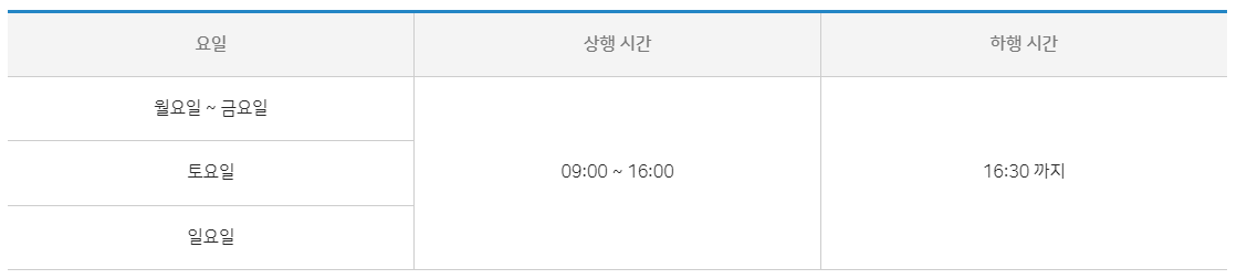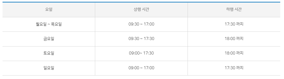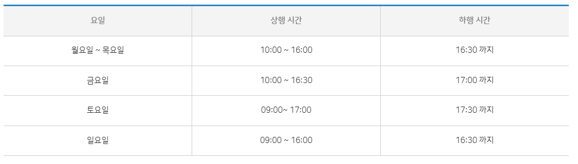 케이블카 비수기 이용시간은 아래와 같은데요. 동계 폐장일 ~ 4월 28일, 11월 1일 ~ 스키곤도라 오픈전까지에는 아래와 같이 운행됩니다.