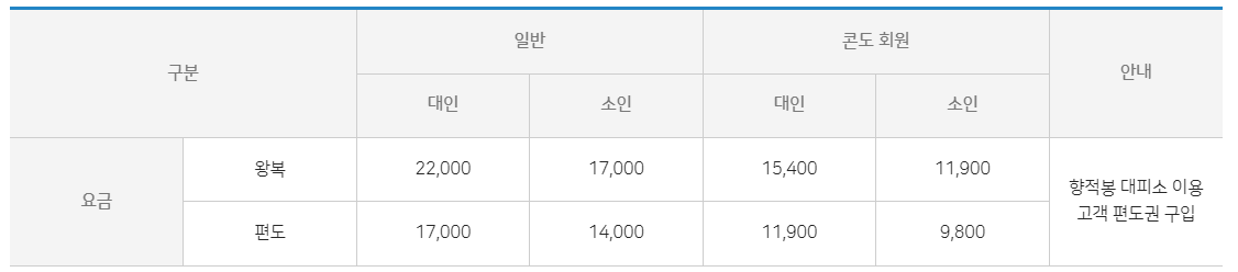 가격표를 살펴보면, 대인과 소인을 나누어 각각의 왕복권과 편도권이 있습니다. 대인은 22,000원으로 왕복을 이용할 수 있고, 소인은 17,000원으로 왕복을 이용할 수 있습니다. 또한 대인과 소인을 위한 편도권도 있으며, 대인은 17,000원으로 소인은 14,000원으로 이용 가능합니다.