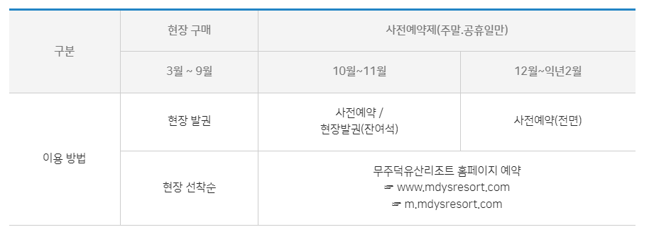 10월~2월사이에는 평일은 당일 현장발권만 가능하며 주말 및 공휴일은 사전 예약제로 운영됩니다. 예약은 탑승일 2주전 오후 5시부터 예약가능합니다. 단, 객실/숙박패키지 예약자는 투숙일에 한하여 예약 후 즉시 곤도라 사전 예약 가능합니다.