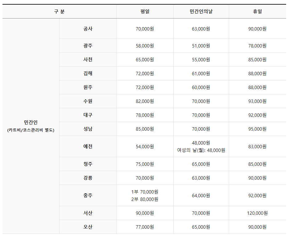 민간인 요금은 각 체력단련장별로 다른데요. 공사 체력단련장은 평일 7만원, 민간인의 날 63,000원 휴일 9만원입니다. 아래 요금표를 확인하세요.
