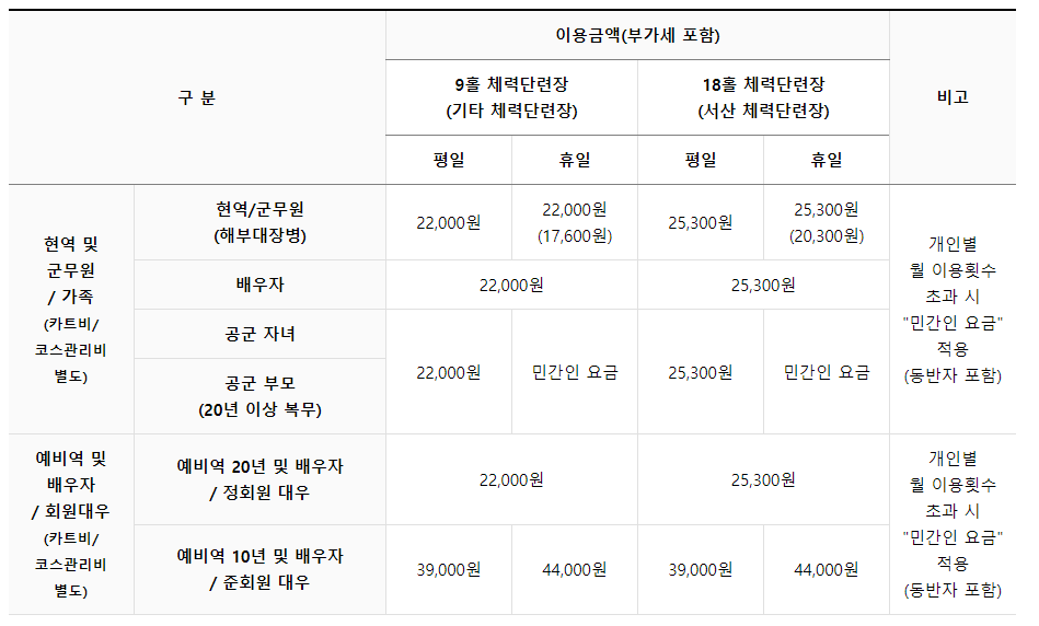 체력단련장 이용요금은 현역, 예비역, 민간인에 따라 다른데요. 아래는 현역과 예비역 및 가족의 이용요금입니다. 현역의 경우 9홀 요금 22,000원으로 평일 주말 동일합니다. 18홀은 서산 체력단련장만 해당하는 요금으로 25,300원입니다. 카트와 코스관리비는 별도인 요금입니다.