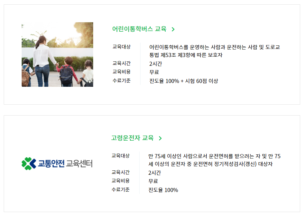 고령운전자 교육 외에도 어린이통학버스 교육, 긴급자동차 교육, 교통안전 담당교사 교육을 제공하고 있습니다. 긴급자동차 교육을 제외하고 모두 무료로 교육을 제공합니다.