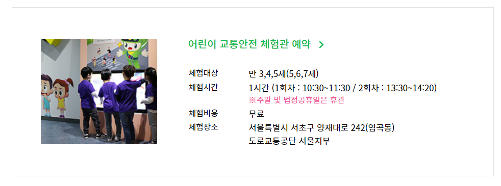 또 도로교통공단 이러닝에서는 어린이 교통안전 체험관을 제공하고 있는데요. 어린이를 위해 무료로 체험관을 운영중이며 만 3,4,5세 어린이를 대상으로 제공합니다. 체험장소는 서울 서초구 양재대로 242 번이며 체험시간은 1시간입니다.