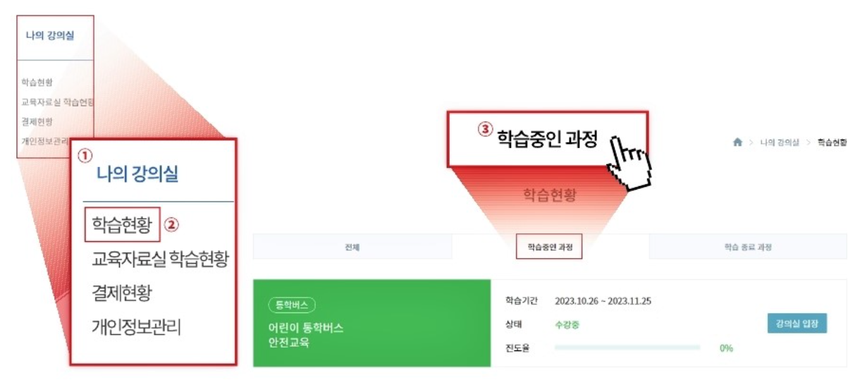 5. 신청하신 과정은 나의 강의실 > 학습현황에 접속하시면 확인가능합니다.