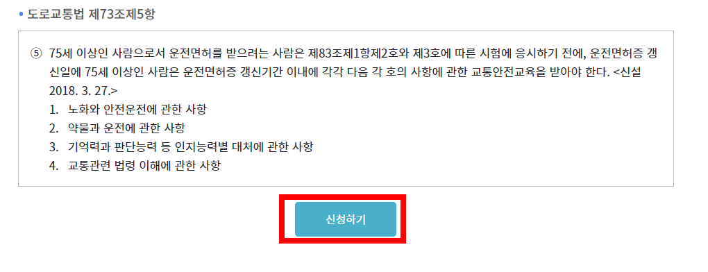 본 교육은 만 75세 이상의 운전자 중 운전면허 정기적성검사(갱신) 대상자를 대상으로 하며 수강신청은 상시 가능합니다. 수강기간은 홈페이지에서 신청 후 30일이내 수강을 완료해야 하며 수료조건은 진도율 100%입니다. 수강신청 방법 알아보겠습니다.