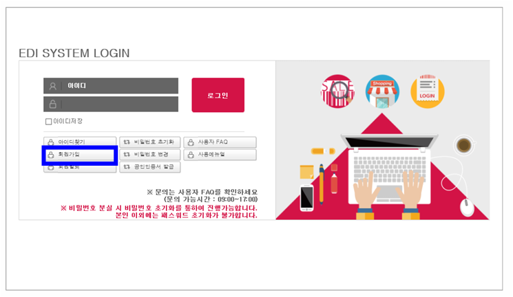 먼저, 스마트 EDI 시스템에 접속해 주세요. 시스템을 이용하기 위해서는 회원가입이 필요해요. 이미 회원이라면 로그인해 주세요. 회원가입 시 필요한 정보를 입력하고, 인증 절차를 완료하면 됩니다.