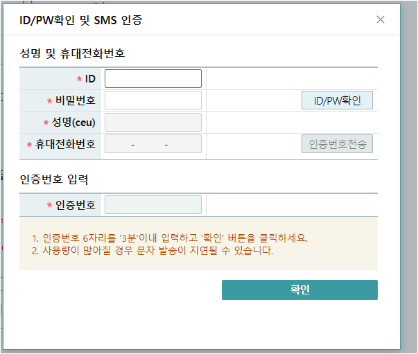 - ID를 모르는 경우: 아래의 ID/PW찾기 버튼을 클릭하여 사용자 아이디 찾기를 통해 진행하세요.