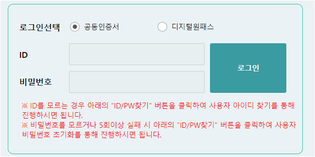3. 로그인 버튼 클릭: 로그인 버튼을 클릭하면 공동인증서 팝업 또는 디지털원패스 로그인 페이지로 이동하게 됩니다.
