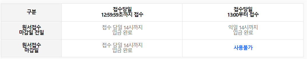 가상계좌 채번 및 수수료 입금 기한은 인터넷접수 기간 중입니다. 가상계좌번호를 부여받은 후 아래의 기한까지 수험원서 접수 수수료를 입금하지 않으면 수험원서 제출이 자동으로 취소됩니다. 가상계좌를 통한 입금 시, 주거래 은행의 신용도와 창구 이용 또는 자동화기기 이용에 따라 은행별로 입금수수료가 부과될 수 있습니다.
