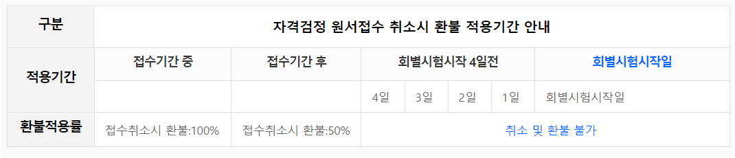 접수기간 이후부터 해당 회차 검정시행일의 5일 전까지 접수를 취소할 경우: 50% 환불이 이루어집니다. 단, 은행의 정책에 따라 23:30 이후에는 환불이 제한될 수 있습니다. 상시 검정 필기시험의 경우 접수 후 차주 시행으로 환불(50%) 절차가 폐지되었습니다.