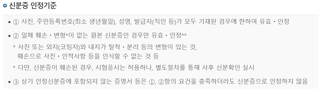 수험자가 제시할 수 있는 신분증은 다양한 종류로 나눠지는데요. 모든 수험자가 사용 가능한 주요 신분증으로는 주민등록증, 운전면허증, 여권, 공무원증, 장애인등록증, 국가유공자증, 국가기술자격증, 동력수상레저기구 조종면허증 등이 있습니다. 그 외에도 특정 수험자 그룹에 해당하는 경우 해당 그룹에 한정된 신분증을 제시할 수 있습니다. 초중고 및 만 18세 이하인 경우에는 학생증이나 학교 발급 재학증명서 등을 제시할 수 있으며, 미취학 아동의 경우에는 임시신분증을 사용할 수 있습니다. 또한, 사병(군인)과 외국인은 각각의 신분증을 제시하여 신분을 확인합니다.