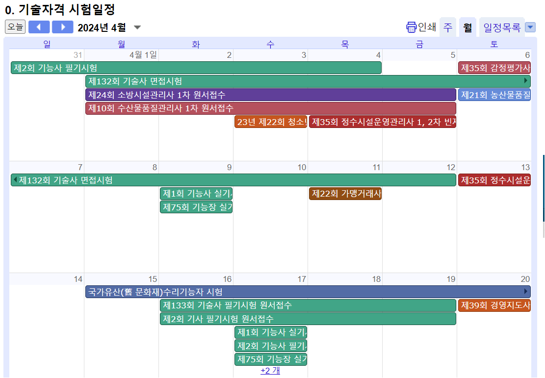 큐넷에서는 월간 시험일정을 캘린더로 안내하고 있는데요. 아래와 같이 일정이 일목요연하게 정리되어 있어 확인 후 준비를 하기 좋습니다. 홈페이지 > 시험일정에서 확인가능합니다.