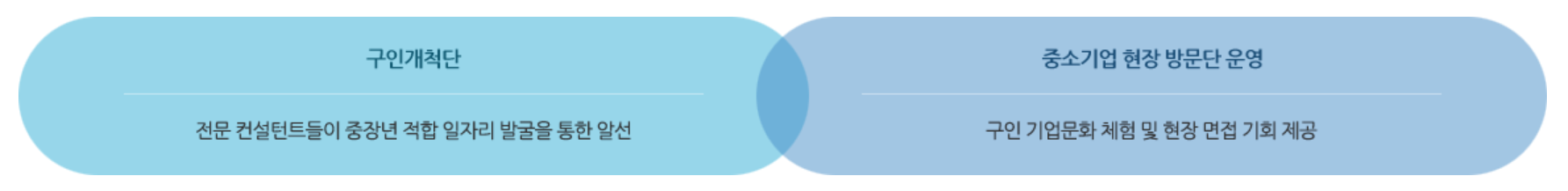 이에는 1:1 맞춤 재취업 및 전직 컨설팅, 구인구직 알선 서비스, 중견전문인력 풀 운영 및 매칭서비스, 그리고 구직을 위한 다양한 교육프로그램 등이 포함됩니다. 이력서 작성부터 면접 코칭까지 철저한 지원을 통해 구직 활동을 지원하며, 이를 통해 중장년 층의 취업 성공을 돕고 있습니다.
