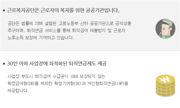 근로복지공단에서는 DC형(확정기여형)과 IRP(개인형 퇴직연금) 중심으로 운용하고 있습니다.