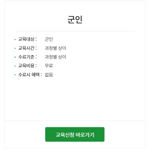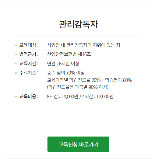 인터넷교육센터에서는 사업장 관리감독자, 근로자 안전에 필요한 직무를 위한 과정을 제공하고 있는데요. 재해를 예방하고 군인과 학생등 안전보건교육이 필요한 분들은 누구나 교육을 받을 수 있습니다. 교육대상은 관리감독자, 근로자 및 학생 등 안전보건교육 희망자 누구나 가능하며 교육비용은 4시간 8,000원 8시간 15,000원입니다.
