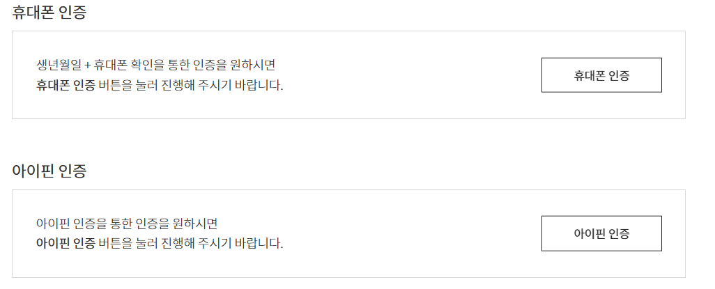 본인 인증: 휴대폰 인증 또는 공공아이핀을 통해 본인 확인 절차를 완료합니다.