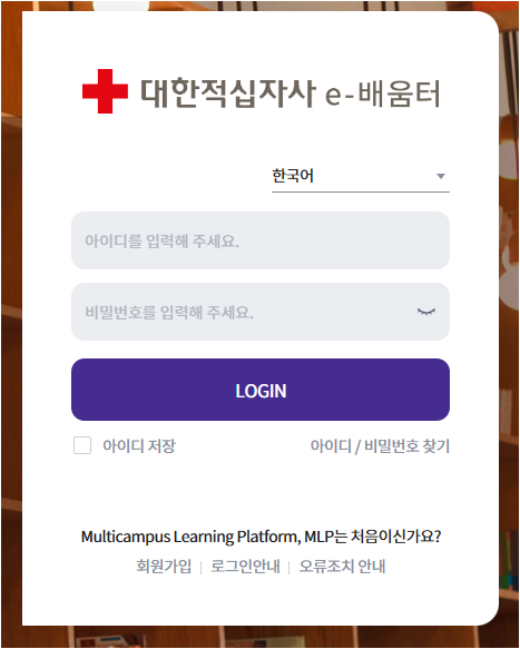e-배움터 홈페이지에 접속하여 회원가입을 완료하고 로그인합니다. 이미 대한적십자사 계정을 보유하고 있다면 바로 로그인이 가능합니다.