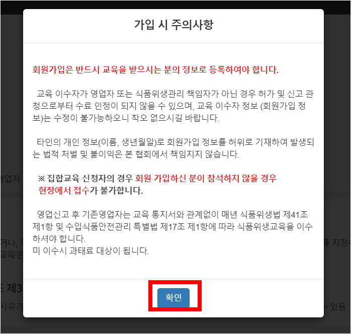 -교육 신청: 등록한 업소 정보를 확인 후, "교육 신청" 버튼을 클릭합니다.