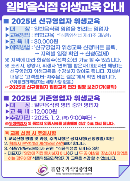 - 신규 영업자 교육 대상자: 식품접객업 허가를 신청하려는 자