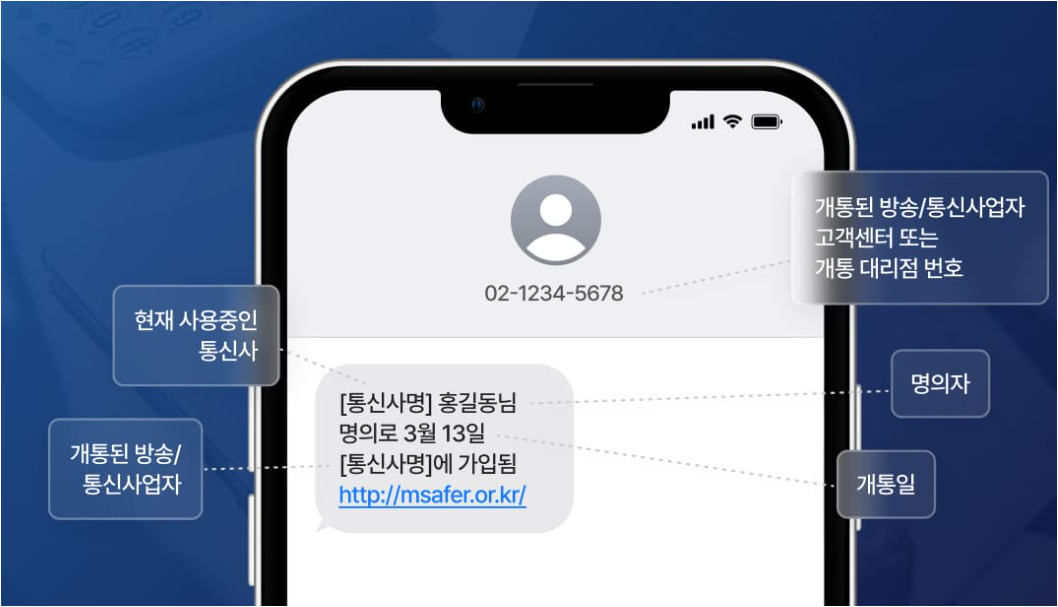 이용자 명의로 신규 개통 또는 명의 변경이 발생하면 본인이 사용 중인 휴대전화로 SMS가 발송됩니다. 이를 통해 의도치 않은 가입 사실을 빠르게 인지할 수 있습니다. 문자 수신이 어려운 이용자를 위해 주민등록표상 주소지로 등기우편을 발송합니다. SMS 미수신 시에도 가입 사실을 확인할 수 있습니다.