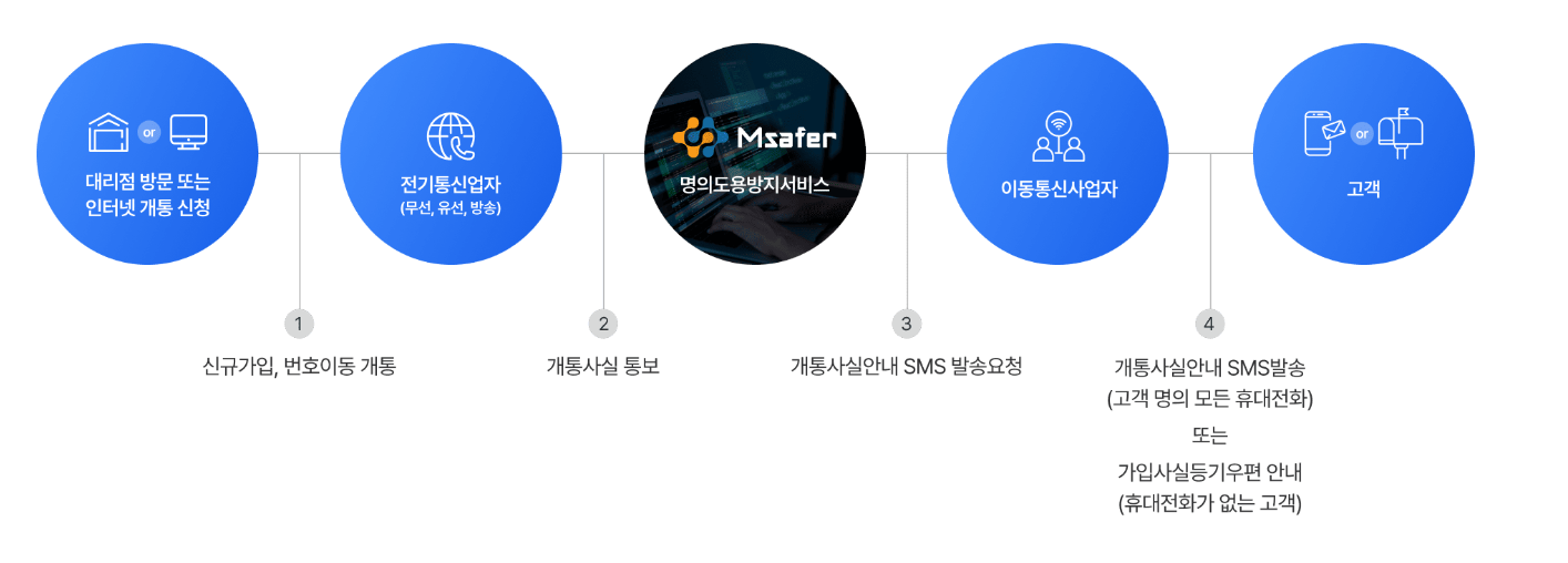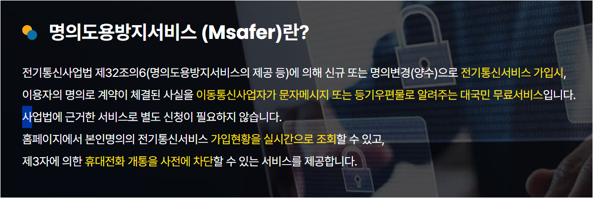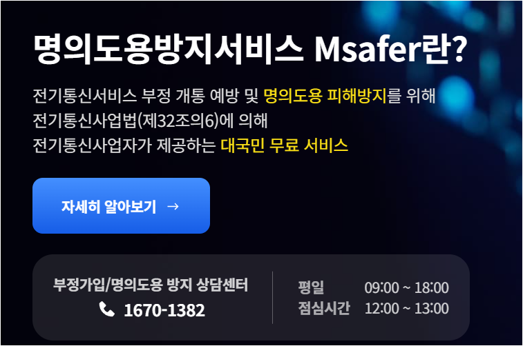 명의도용방지서비스 ‘엠세이퍼(Msafer)’는 본인 명의로 이동통신·인터넷·유선전화·유료방송 등 각종 전기통신서비스가 신규 가입되거나 명의 변경(양수)될 때, 본인에게 즉시 통지를 제공하는 무료 대국민 서비스입니다. 이를 통해 제3자에 의한 무단 개통을 사전에 확인하고 차단할 수 있습니다.