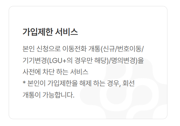 이용자가 직접 신청하면 이동전화 신규가입, 번호이동, 기기 변경 또는 명의 변경 등을 사전에 차단할 수 있습니다. 필요 시 본인이 제한을 해제해야만 신규 개통이 가능해 추가적인 보호막을 형성합니다.