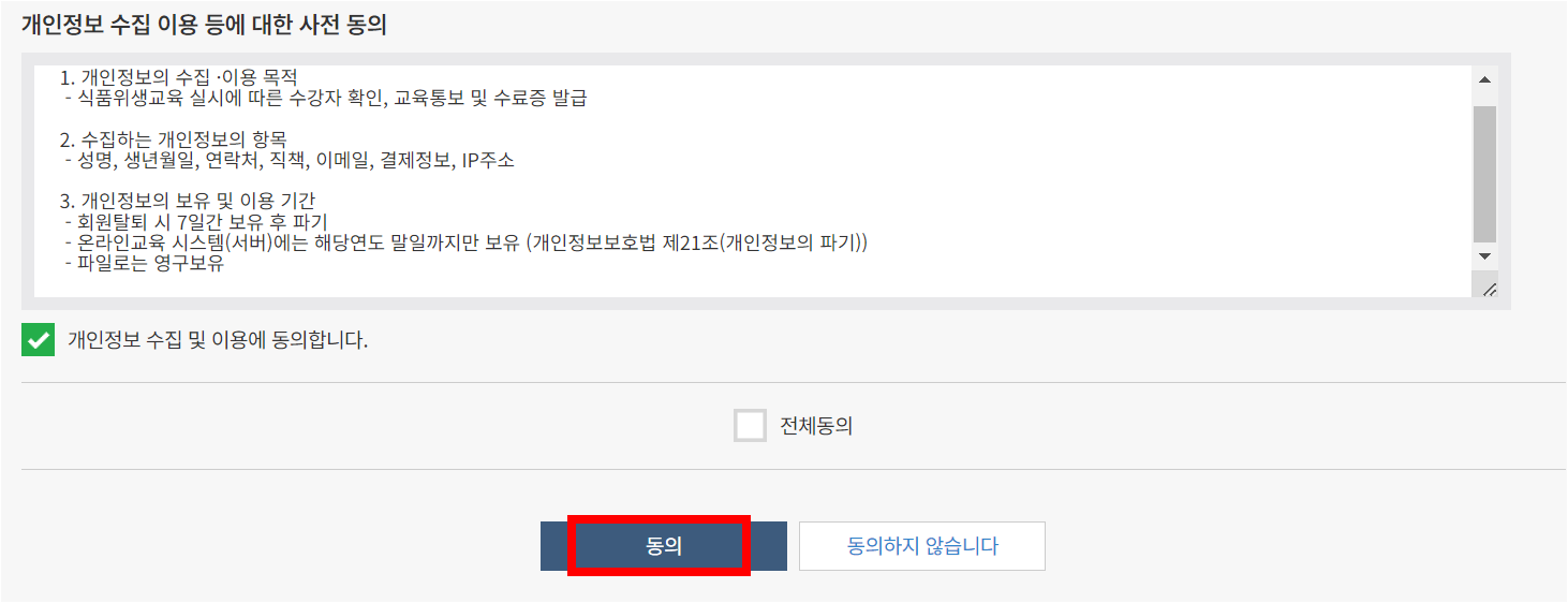 2. 약관 및 개인정보 수집에 전체동의하신 후 동의버튼을 클릭하세요.