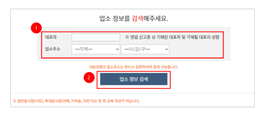 업소 정보 검색: 대표자 이름과 업소 주소(시, 군, 구 단위까지)를 선택한 후, "업소 정보 검색" 버튼을 클릭합니다.