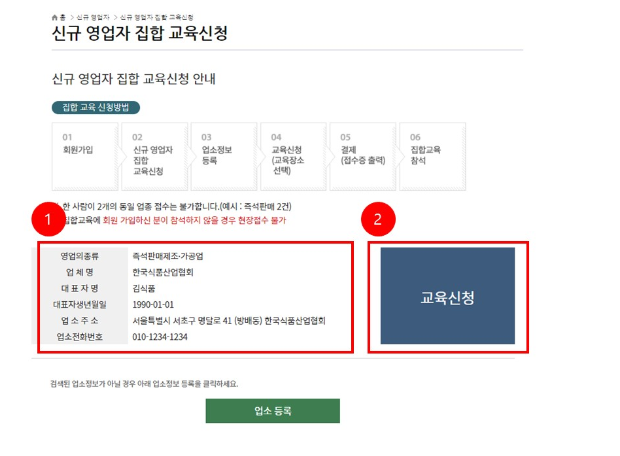 -교육 신청: 등록한 업소 정보를 확인 후, "교육 신청" 버튼을 클릭합니다.
