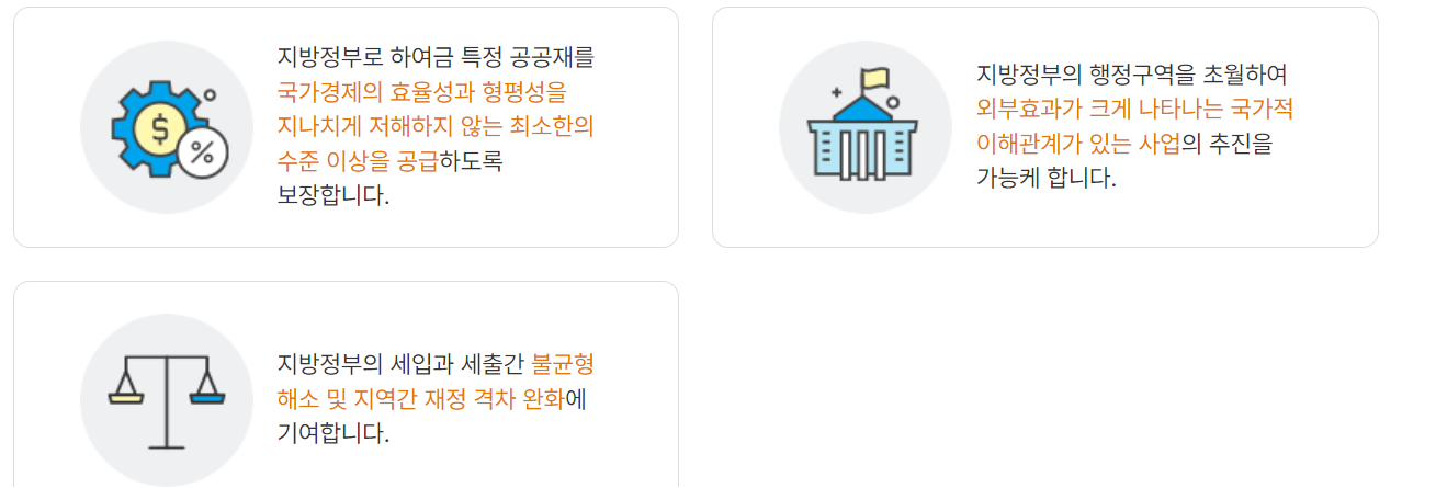 -재정 불균형 해소: 지방정부의 세입과 세출 간 불균형을 해소하고, 지역 간 재정 격차를 완화하여 최소한의 행정 수준을 유지하는데 필요한 재원을 보장합니다.