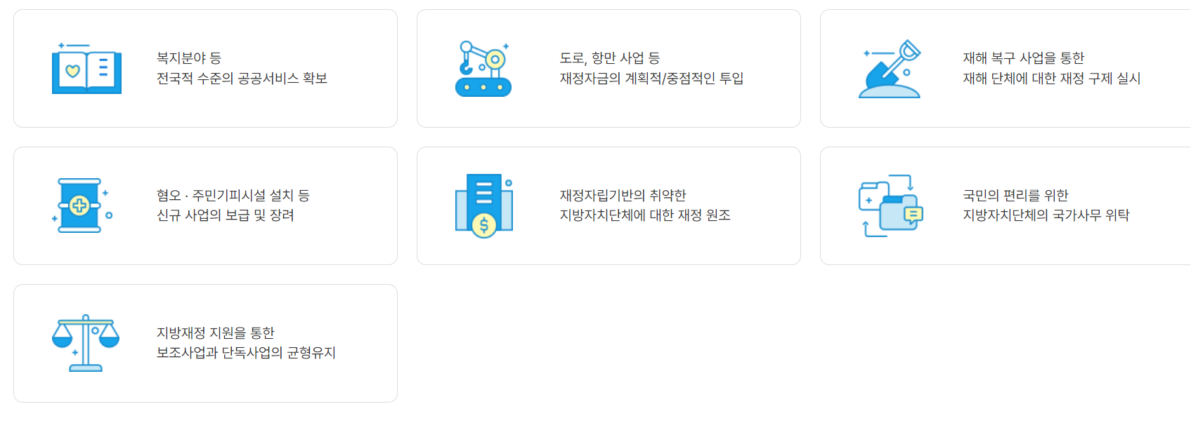 -국민의 편리를 위한 지방자치단체의 국가사무 위탁: 국민 편의를 위해 지방자치단체가 수행하는 국가 사무를 지원합니다.지방재정 지원을 통한 보조사업과 단독사업의 균형 유지: 지방 자치단체의 재정 지원을 통해 사업의 균형을 유지합니다.