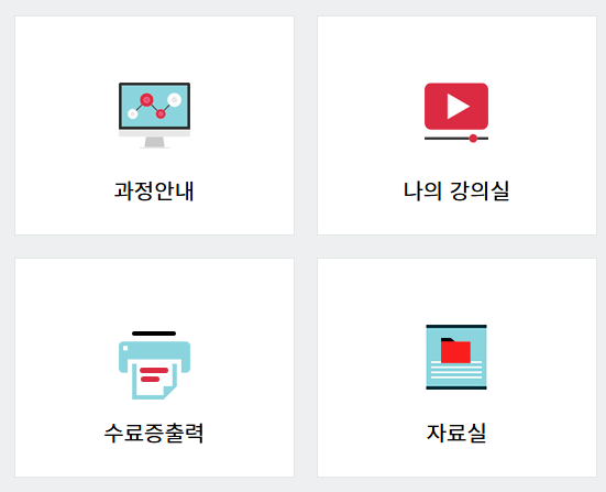 - 로그인 후 ‘과정안내’, ‘나의 강의실’, ‘수료증 출력’, ‘자료실’ 메뉴가 활성화되어 학습 관리