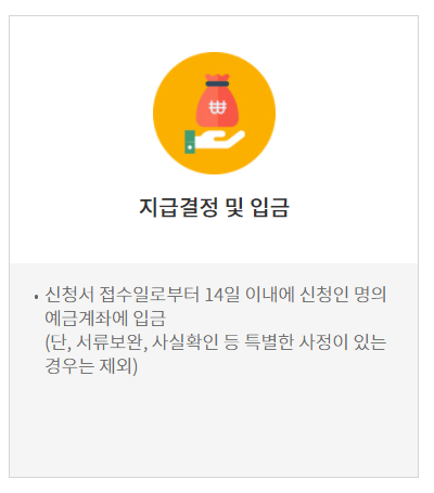 입금 시기: 신청서 접수일로부터 14일 이내에 신청인 명의 예금계좌에 입금