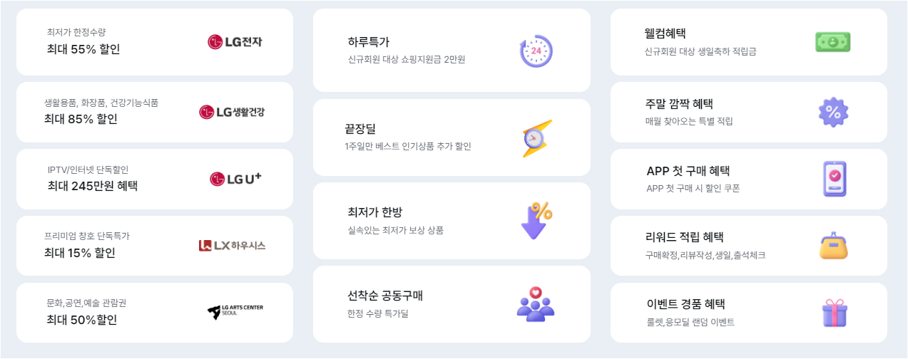 LG복지몰은 LG그룹 임직원들이 다양한 복지 혜택을 누릴 수 있도록 마련된 온라인 쇼핑몰입니다. 주요 기능은 다음과 같습니다.