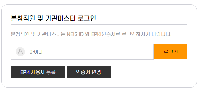 본청 직원과 기관인증서 사용자는 신규 이용 시 'EPKI 사용자등록'이 필요합니다. 관리자의 승인을 받은 후 로그인이 가능합니다. 인증서를 갱신한 경우에는 반드시 '인증서변경'을 통해 인증서를 변경등록해야 합니다. 참고로, 본청 직원의 아이디 및 인증서 등록정보는 본청 외로 인사이동 시 삭제됩니다.