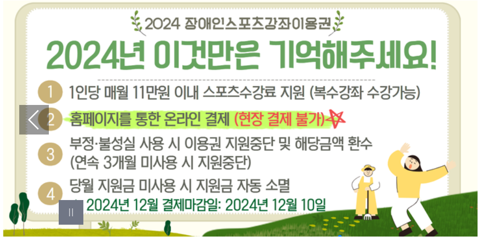 - 이용권 신청: 장애인은 홈페이지를 통해 스포츠강좌 이용권을 신청할 수 있습니다. 신청 과정에서 필요한 서류와 절차를 안내합니다.
