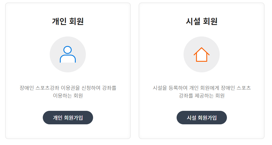 1. 홈페이지에 접속하신 후 회원가입 버튼을 클릭하세요. 그다음 개인회원인지 시설회원인지 선택하세요.
