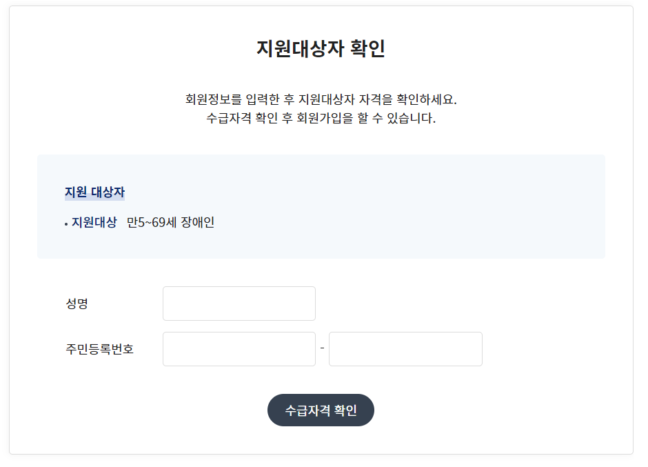3. 지원대상자인지 확인해야 하므로 이름과 주민등록번호를 입력하세요. 만5세부터 69세 장애인만 지원됩니다.