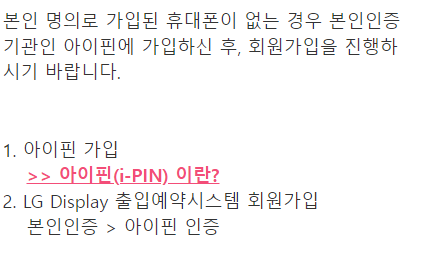 lg디스플레이 출입예약시스템은 LG Display를 방문하는 사람들의 출입을 관리하기 위해 방문시 미리 홈페이지를 통해 예약할 수 있도록 제공하고 있는데요. 휴대폰 본인인증을 통한 회원가입 후 출입예약이 가능합니다.