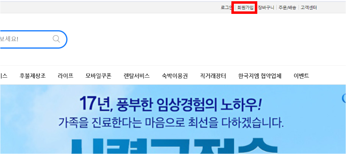1. 복지몰에 접속하신 후 상단의 회원가입 버튼을 클릭하세요.