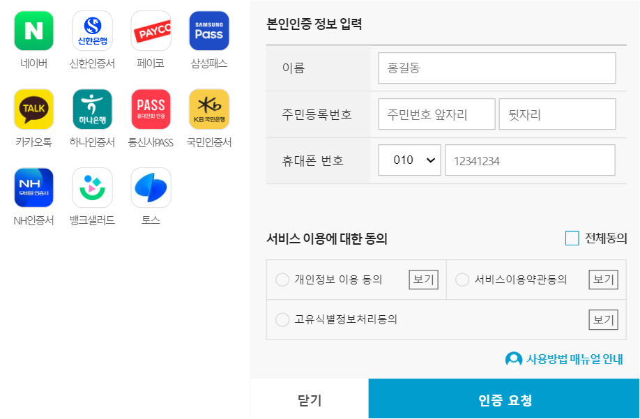 3. 필수약관 모두 동의하신 후 본인명의 휴대폰으로 본인인증을 완료하세요.
