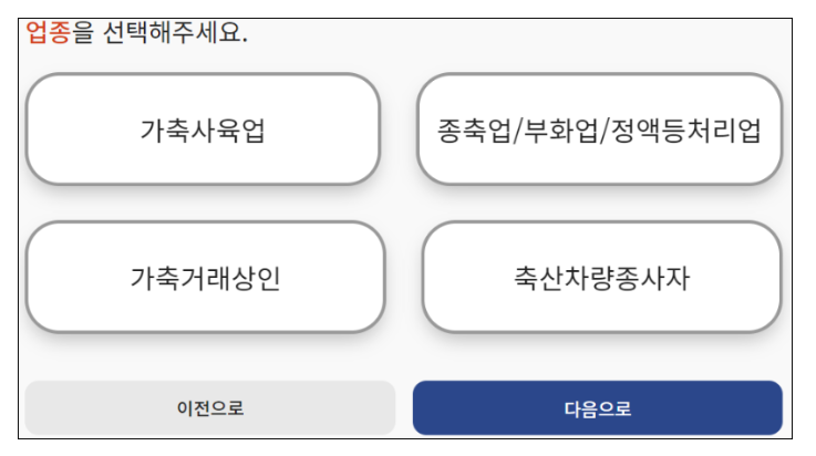 7. 업종을 선택하세요. (가축사육업, 가축거래상인, 종축업, 축산차량종사자 중에서 선택)