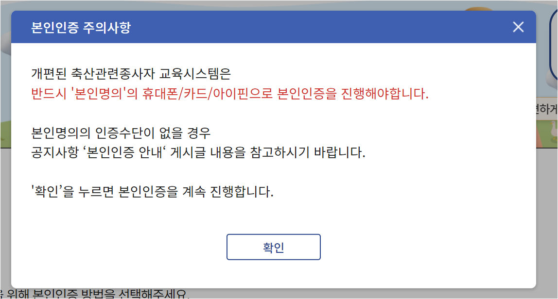 2. 본인인증 주의사항을 확인하신 후 확인 버튼을 클릭하세요. ( 기존에 교육을 받으셨던 분들은 별도 회원가입 없이 이전에 사용하던 아이디로 직접 로그인할 수 있습니다. 아이디를 확인하기 어려운 경우 1833-4265로 연락하시면 확인가능합니다.)