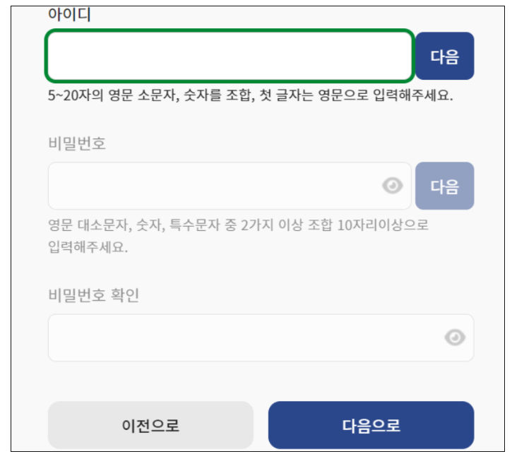 4. 사용하실 아이디와 비밀번호를 입력한 후 다음으로 버튼을 클릭하세요.