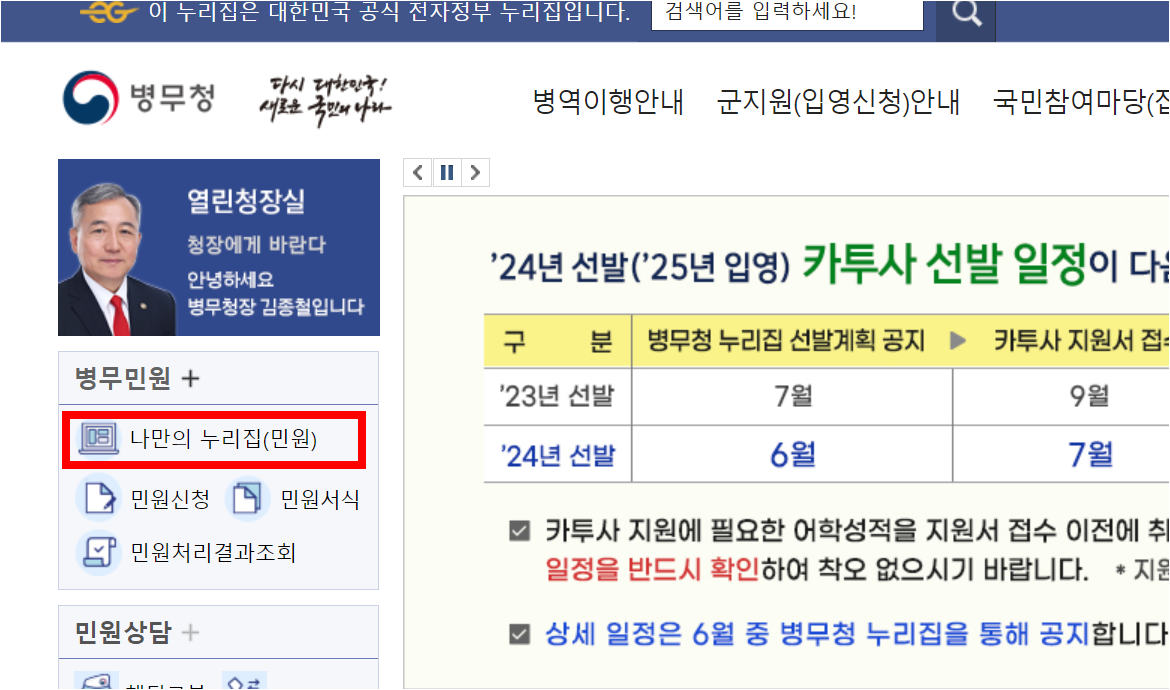 2. 병무청 홈페이지에 접속하신 후 메인화면의 왼쪽메뉴에서 '나만의 누리집(민원)' 을 선택하세요.