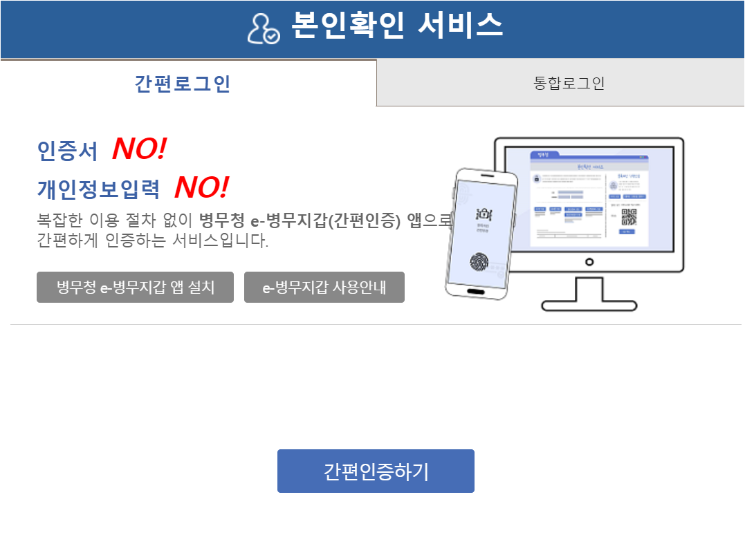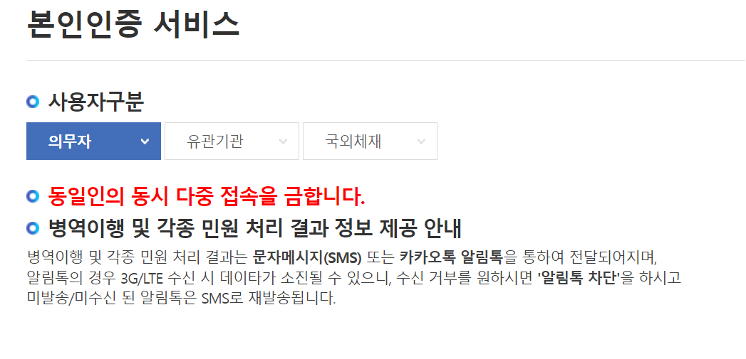 • 병무민원포털 본인인증(로그인) 전에 인증이 필요한 서비스로 진입할 경우 해당 인증 절차를 완료합니다.